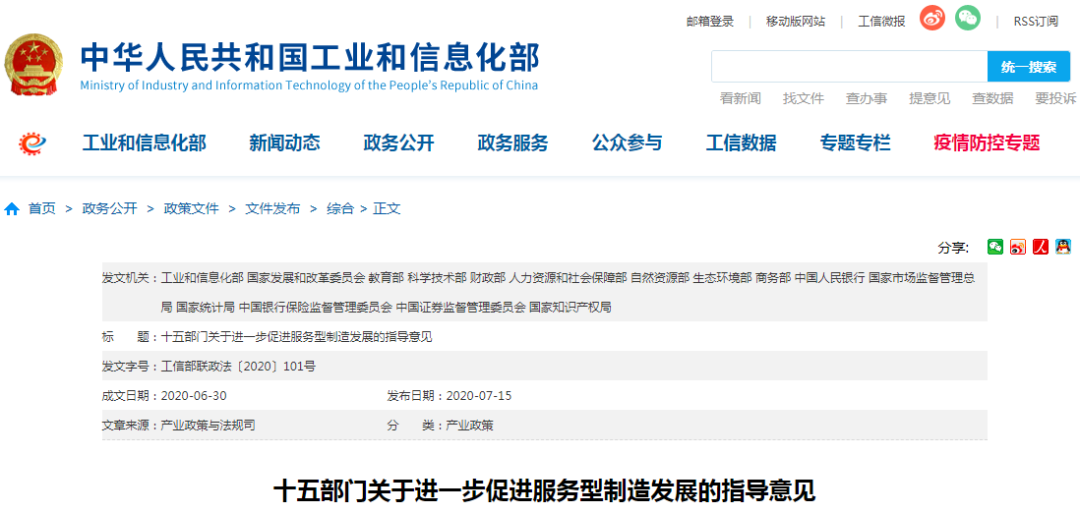 为贯彻党中央、国务院关于推动先进制造业和现代服务业深度融合,发展服务型制造的决策部署,推动制造业高质量发展,工业和信息化部会同发展改革委、教育部、科技部、财政部、人力资源社会保障部、自然资源部、生态环境部、商务部、人民银行、市场监管总局、统计局、银保监会、证监会、知识产权局等15部门联合印发了《关于进一步促进服务型制造发展的指导意见》(下称《指导意见》)。