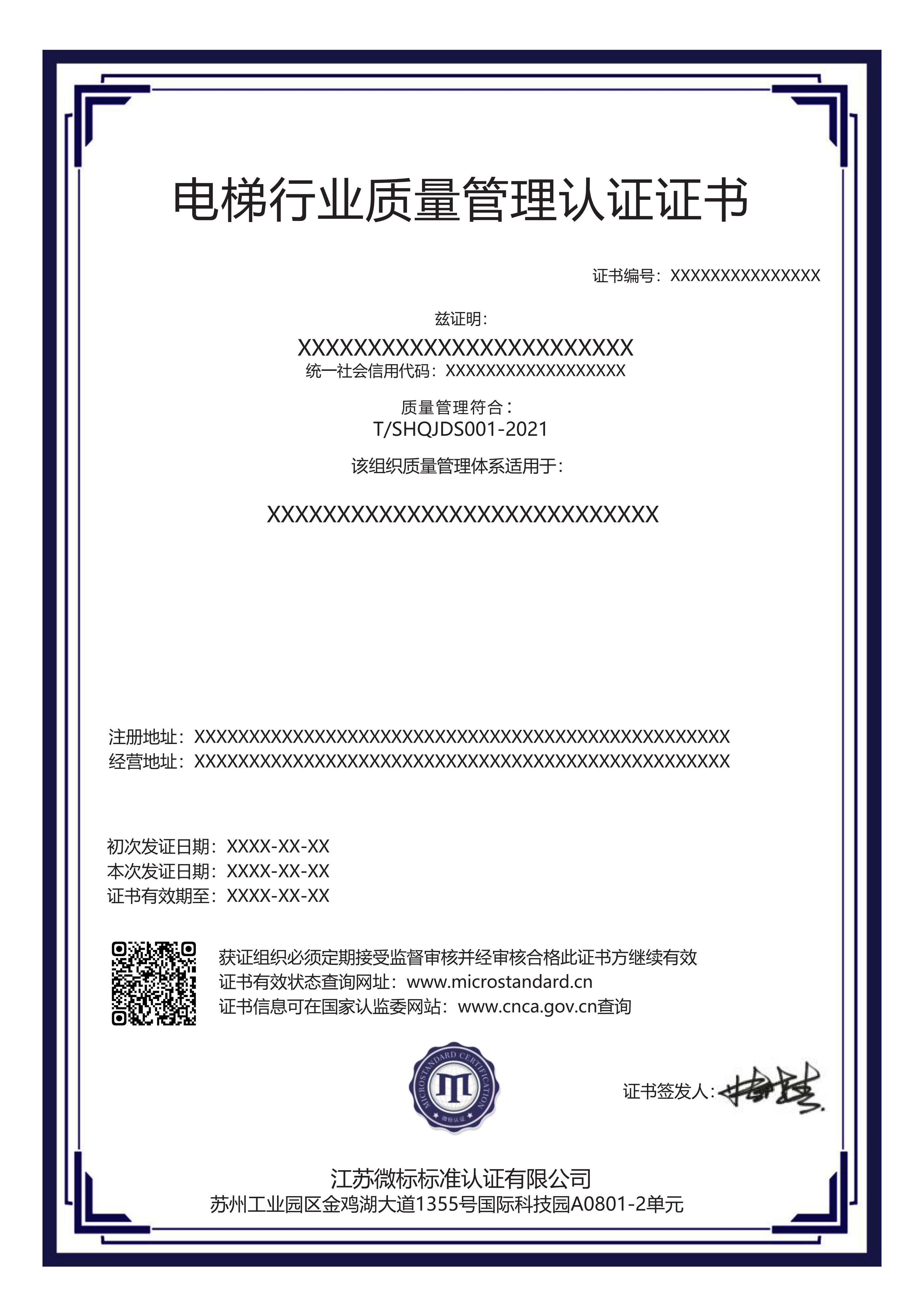 电梯行业质量管理认证证书